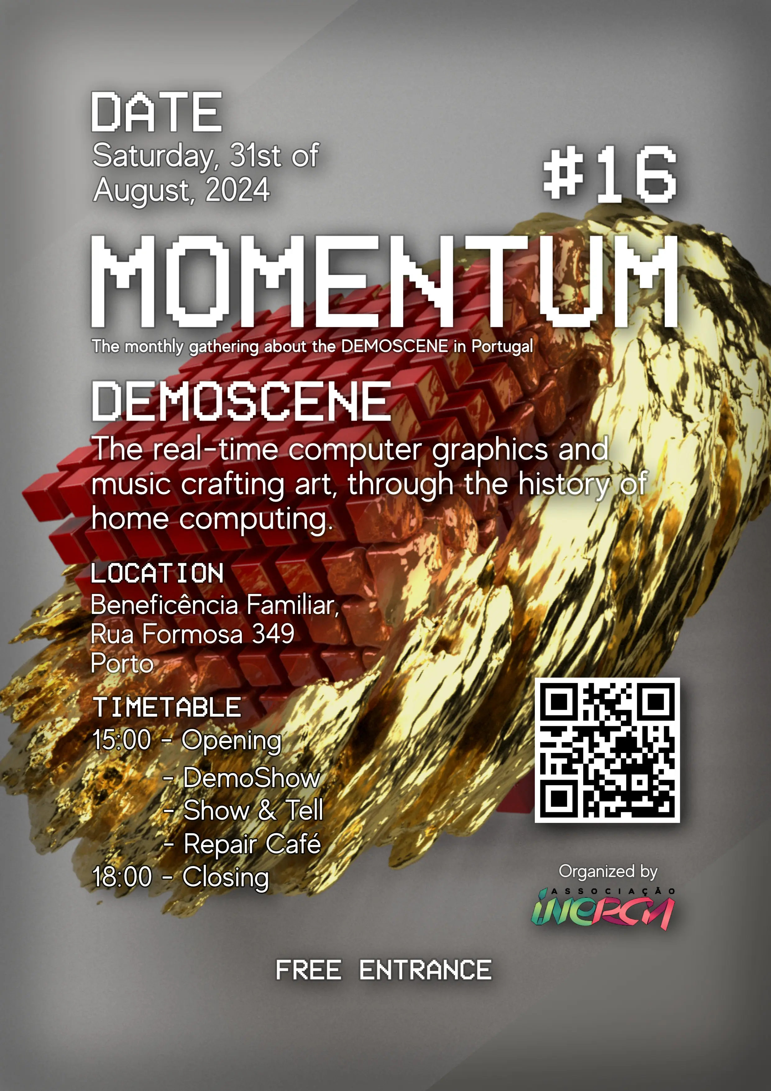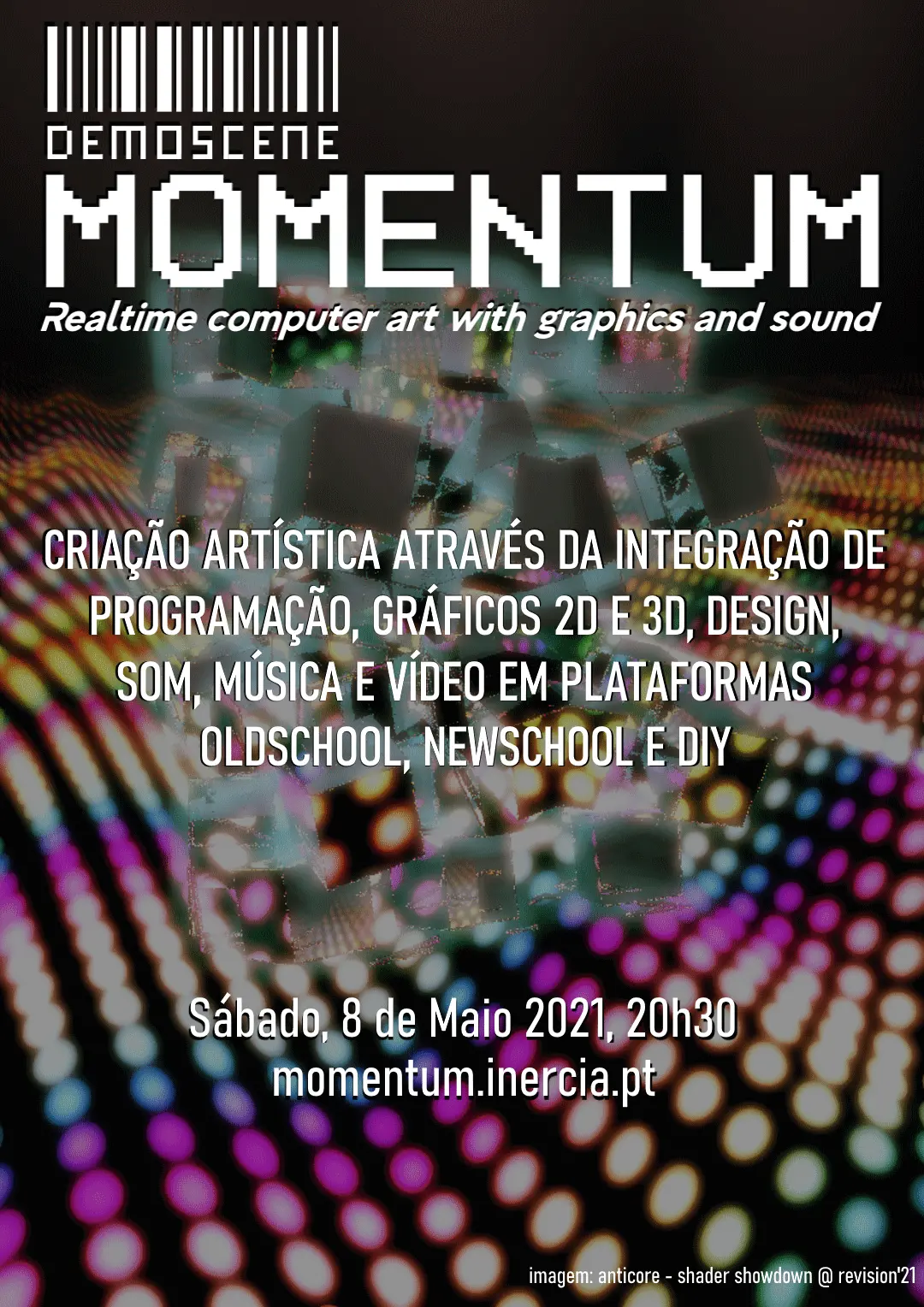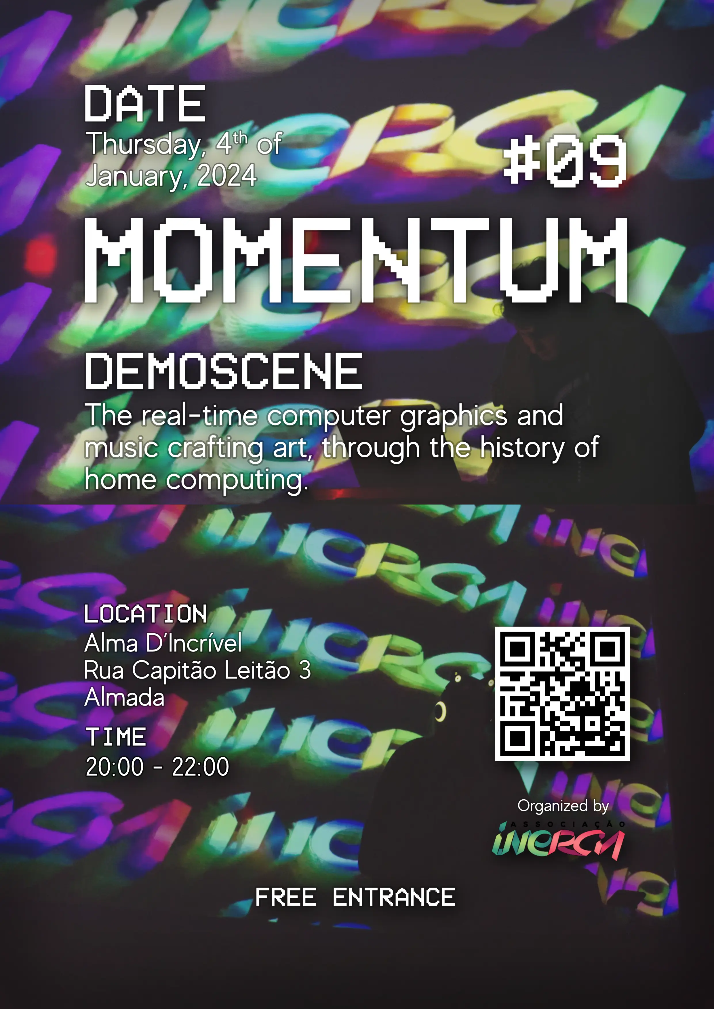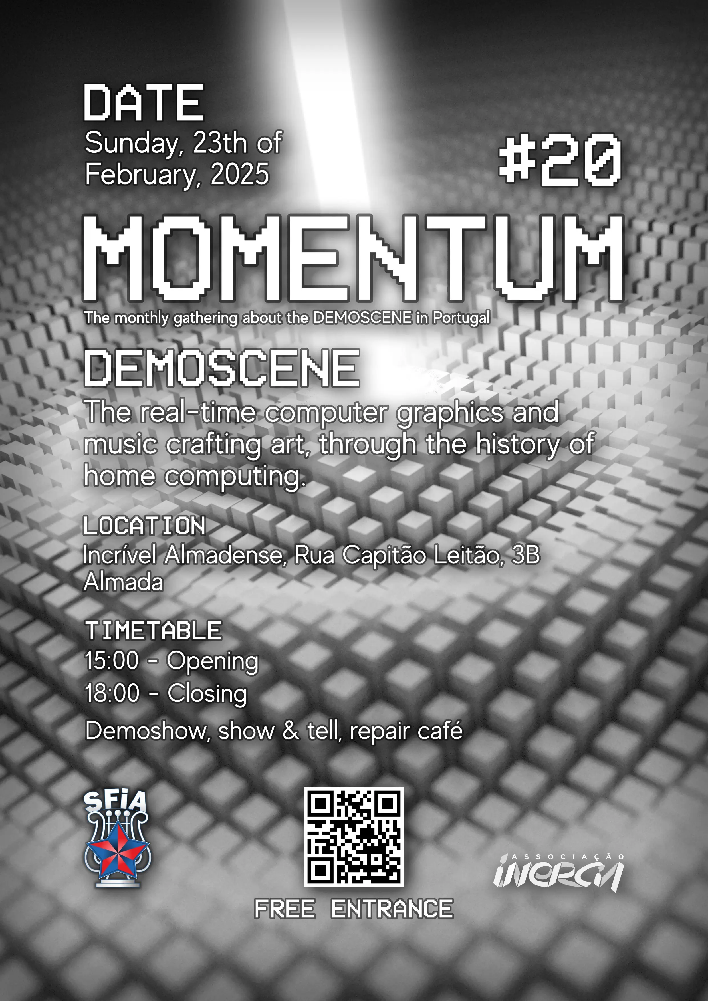 Momentum é um encontro mensal de entusiastas da Demoscene portuguesa. Para os veteranos é uma boa oportunidade de voltar ao ativo, para as pessoas curiosas é uma oportunidade de conhecer melhor a comunidade ativa da Demoscene em Portugal.